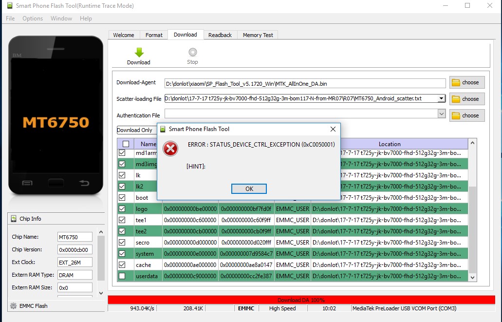 in flash update method, stopped at scatter read process by SP Flash Tool